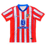La nueva camiseta de fútbol del Atlético de Madrid 2024-25 tiene una versión única de las clásicas rayas rojas y blancas del club. Es principalmente roja (Lt Crimson) con rayas blancas únicas y un borde azul en el exterior. Dentro de las rayas, se alternan líneas azules y rojas con un efecto de desvanecimiento para crear una apariencia única. Presenta un falso cuello en V, como las camisetas de Inglaterra y Brasil 2024.