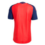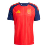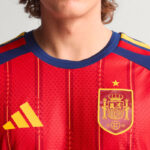 La camiseta local Adidas de España para el Mundial 2026 combina un cuerpo rojo intenso con mangas azul marino oscuro. Un detalle atractivo son las tres rayas de los hombros en rojo, amarillo y rojo, los colores de la bandera española. Rayas finas verticales amarillas recorren la equipación, con detalles de puntos.