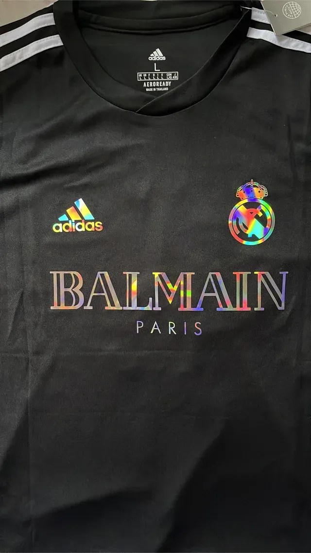 La camiseta de fútbol conceptual cromada del Real Madrid x Balmain 2023/23. Esta camiseta de manga corta viene en color negro con detalles de Balmain en contraste.